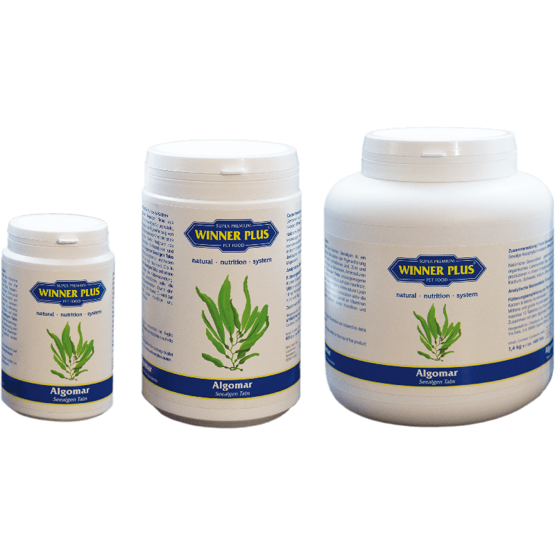 WINNER PLUS Algomar Seaweed Tabs, gemaakt van vers zeewier, is een hoogwaardig natuurproduct dat de optimale stimulatie van de pigmentatie van vacht, neus en voetzolen bevordert door het gehalte aan jodium, zink en carotenoïden.
