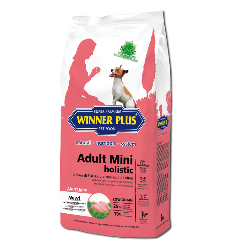 WINNER PLUS Adult Mini holistic is een 100% natuurlijk en compleet voer, gemaakt zonder gluten en maïs, voor volwassen honden van kleine rassen