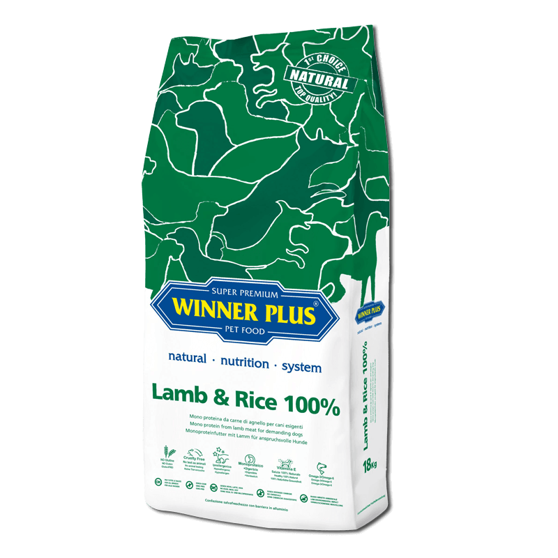 WINNER PLUS Lamb & Rice 100% is een complete voeding voor honden, monoproteïne en glutenvrij. Bevat 28% eersteklas lamsvlees, als enige bron van dierlijke eiwitten en als enige bron van koolhydraten. Dankzij de licht verteerbare formule is dit voer bij uitstek geschikt voor honden met een gevoelige maag en darmen of met allergieën tegen vis of verschillende vleessoorten, evenals voor honden met voedselintoleranties.